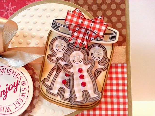 Now for another great Memory Box find...this little tag cut with the Pocket Tag die! Perfect to slip a little something in...we tried a gift card which didn't quite fit, but some dollar bills did :)! I "Stickled" up my favorite candy cane from Waltzingmouse Stamps' Sewing Box-Christmas, and placed it on the outside pocket. I actually cut 2 tags with the die and used patterned paper for the pocket flap (it's glued over the original black cardstock flap). The cute reinforcer piece is cut with a die included with the tag.